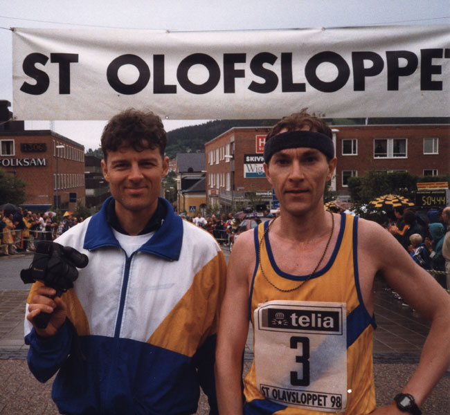 Trond Olav (med videokamera) og Hermann etter nok en dagsetappe - her i 1998. Siden 1996 har Hermann og Trond Olav gjennomført 30 etapper hver, med en samlet lengde på henholdsvis 429 og 422,4 kilometer. Hermann og Trond Olav har for øvrig utgjort et stabilt innslag i Bølers langdistansemiljø siden 1996. Begge har tatt totalseire i Nøklevann Rundt. Hermann har oppnådd 32.35 som bestetid på 10 km (1997), mens Trond Olav har prestert 32.00 på 10 km (1995) og 1.10.46 på halvmaraton (2000).