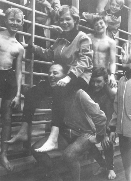 Den populære Arnvid Kavli viser knebøy i gymsalen. Barnas glade uttrykk viser tydelig at aktiviteten er motiverende.
