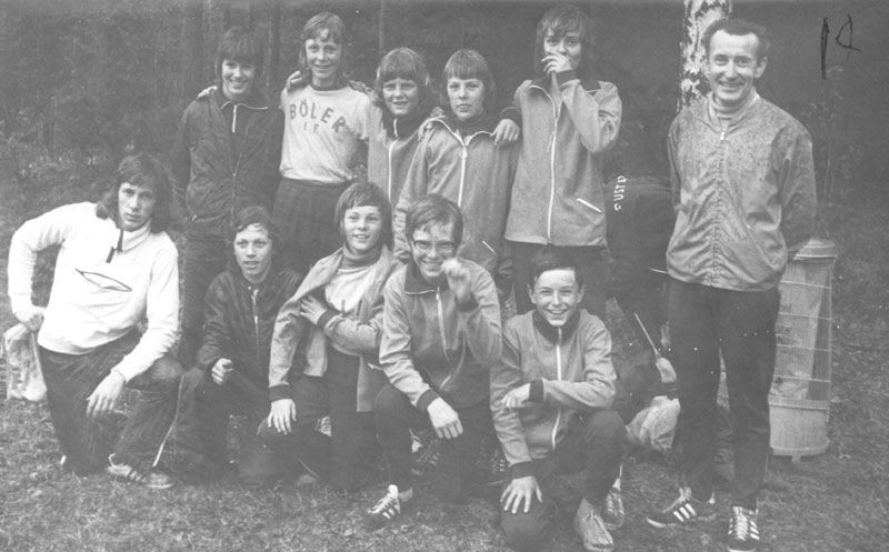 Sverre Larsen sammen med unge utøvere rundt 1972-73, sannsynligvis på Kusletta i forbindelse med Bølerstafetten. Foran fra venstre: Bjørn Gundersen, Jan Erik Gjerdalen, Geir Rune Pedersen, Per Kristian Lund og Bjørn-Inge Larsen. Bak fra venstre: Rune Østvold, Bjørn Bakken, Pål Unum, Lars Hansen, Freddy Holsve (med hånden foran munnen - en uvane han hadde for å skjule reguleringen) og Sverre Larsen. Både Bjørn, Jan Erik, Rune og Pål var aktive langrennsløpere. Bjørn-Inges far Sverre var meget involvert i idrettsarbeidet i Bøler IF i denne perioden.