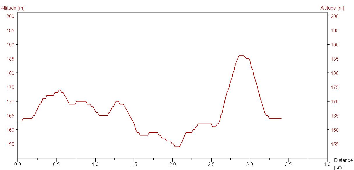 Høydeprofil for rød trasé som er 3,35 km lang, se løypebeskrivelse
