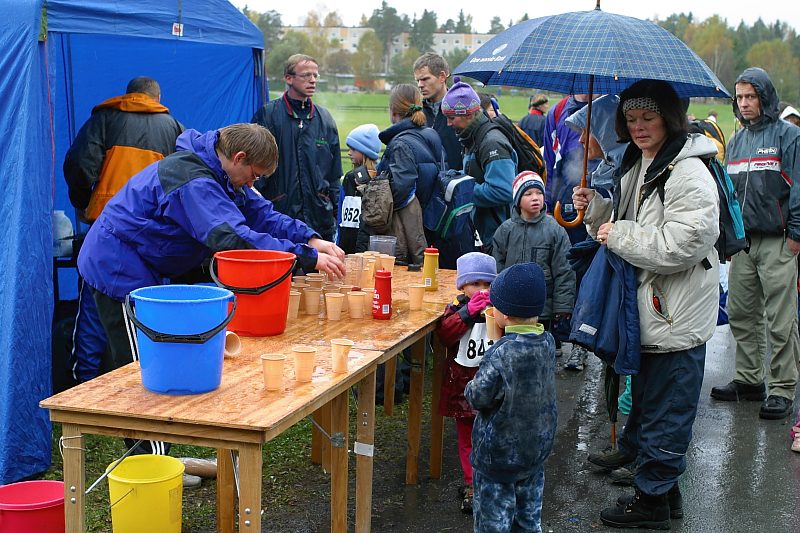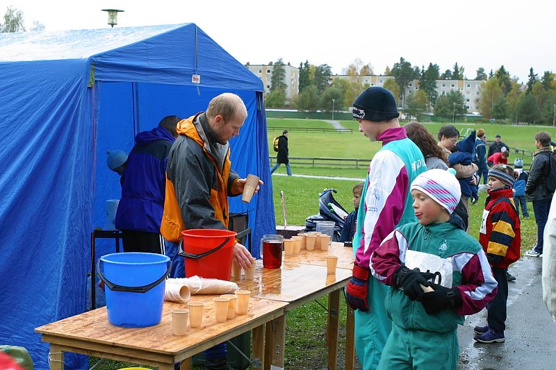 Etter barneløpet spises det pølser (På grunn av heftig snefall ble det helt umulig å ta bilder under selve barneløpet. Først da de voksne skulle løpe sluttet nedbøren)