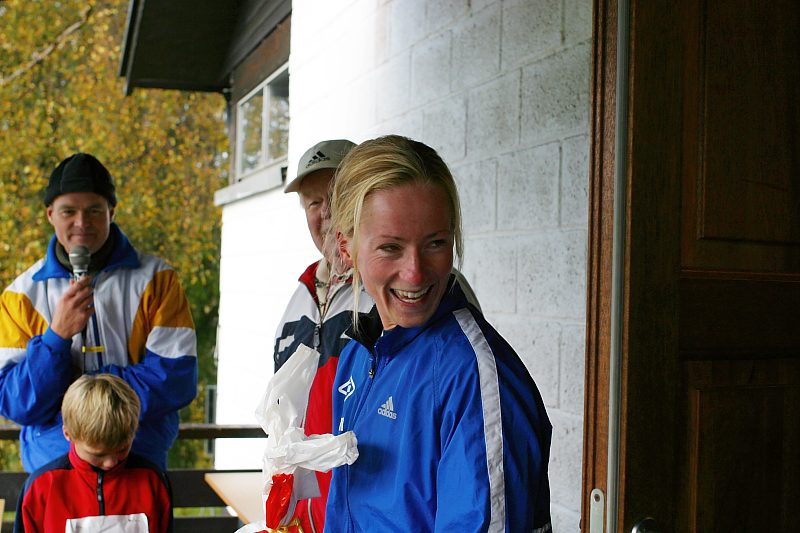 Her er førstekvinne på fem kilometer, Lisbeth Pedersen, under premieutdelingen.