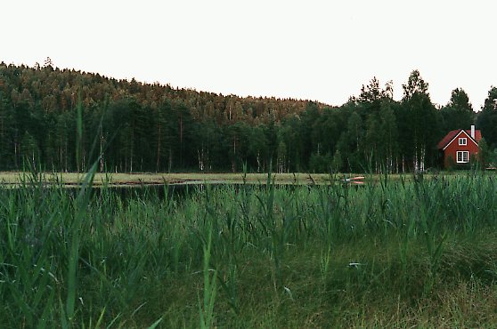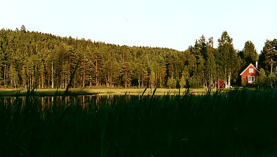 Fra Bysetermosen. Like ved veikrysset der veien kommer opp fra Fjell ligger dette tjernet, med det lille røde huset ved siden av. Bildet er tatt en varm julikveld ved solnedgang.