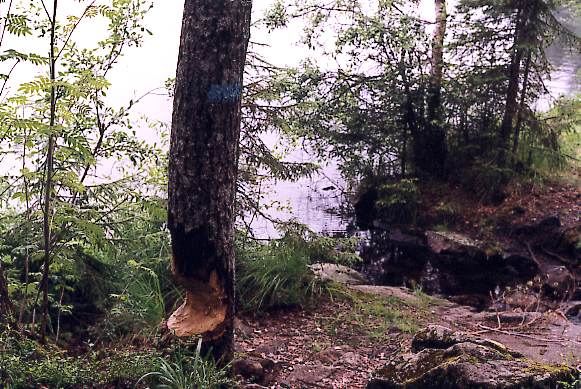 Ved Tonevann nord for Vangen fant jeg denne trestammen. Noen har gnaget seg nesten tvers igjennom den. (Hvem tror du har gjort det?) Som kjent er fiberrik kost både sunt og godt, men de fleste vil likevel vegre seg mot å gå til slike ytterligheter som vi her er vitne til. Den bekken som du ser til høyre i bildet renner fra Tonevann og ned til Mosjøen.