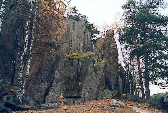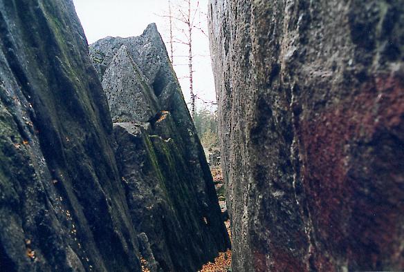 Legger du merke til en sprekk i fjellet som ligger litt til venstre for midten av bildet, tre meter eller så til høyre for bjerketreet? Det er selve inngangsportalen til Hauktjernskløftområdet, kanskje Østmarkas mest ulendte terreng. Følg med!