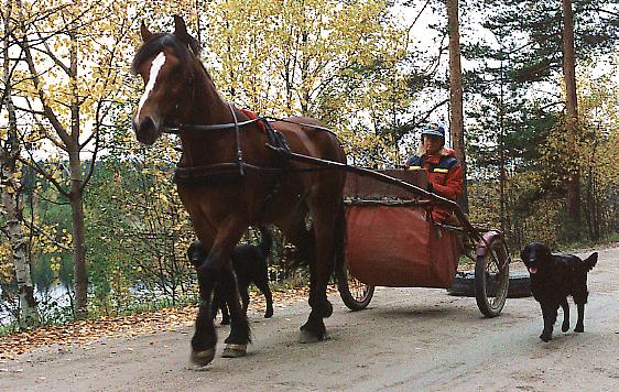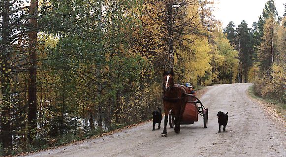 På den veien som går forbi Sætertjernet til Sandbakken, kjøres det ofte med hester. Her kan du se en bildesekvens som viser hestekjøring i oktober.