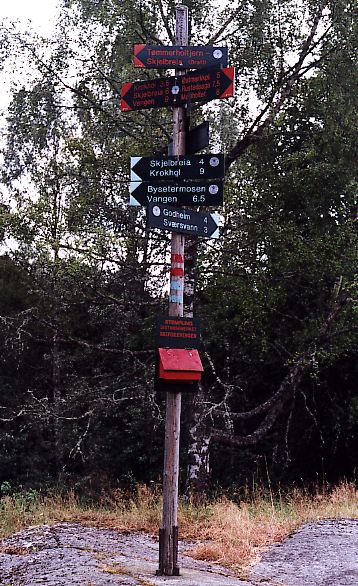 Dette er stolpen med alle skiltene som markerer løypesenteret på Sandbakken. Her ser vi hvordan stier og løyper går i alle retninger. Fra toppen viser det røde skiltet at veien til venstre går til Tømmerholtjern og Skjelbreia. Skilt nr. to ovenfra sier at det er seks kilometer til Skjelbreia langs den rødmerkede stien (skiløypa), og ni kilometer til Vangen. Til Krokhol er det tre og en halv. Skiløypene til høyre fører til Østmarkkapellet etter fem kilometer, Rustadsaga kommer man til etter syv og en halv, mens man må gå åtte kilometer fra Sandbakken for å komme til Mariholtet, som ligger helt i nordenden av Elvåga.