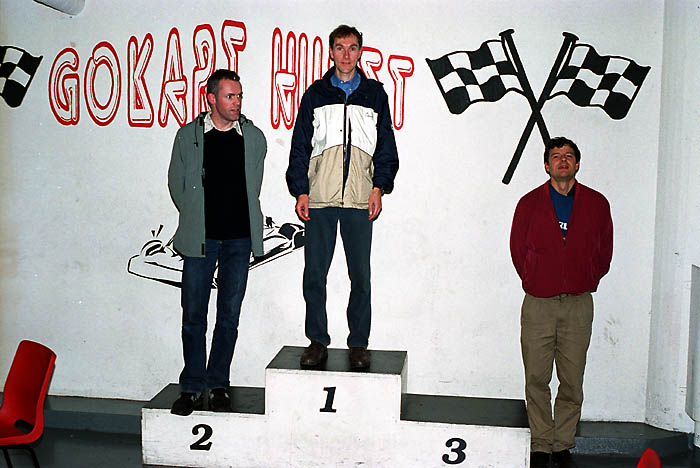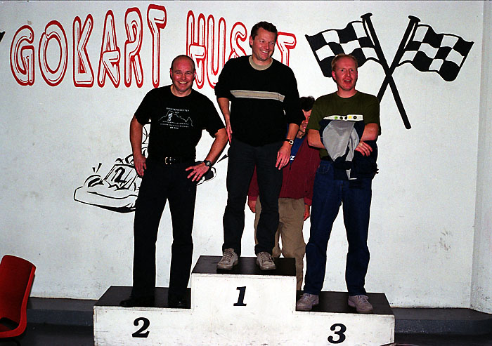 Bilde 7: Dette ble altså resultatet av bilkjøringsmesterskapet. Hva som er interessant her, er å se på hvilken korrelasjon det er mellom løpsprestasjoner og gokartresultater. Vi skal overlate til leserne av Bølersidene å reflektere nærmere over akkurat dette, så vi nøyer oss her med å gratulere de tre medaljørene. I bakgrunnen skimtes forresten en halvt skjult løper som i skam og skjensel gjemmer seg bak sine overmenn på kartbanen. At vedkommende likevel ikke ser ut til å ha mistet humøret, kan jo ha sammenheng med at han forespeiler seg sterke resultater i andre idrettsdisipliner. Hvorvidt disse oppnås gjennom et stort antall rulleskiøkter, er et annet spørsmål.