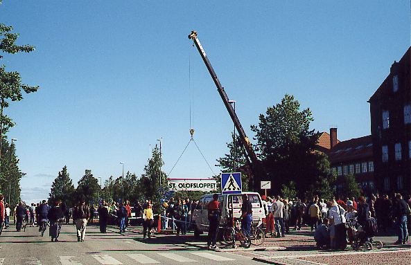 stor kran holder startseilet oppe midt i hovedgaten i svenske
