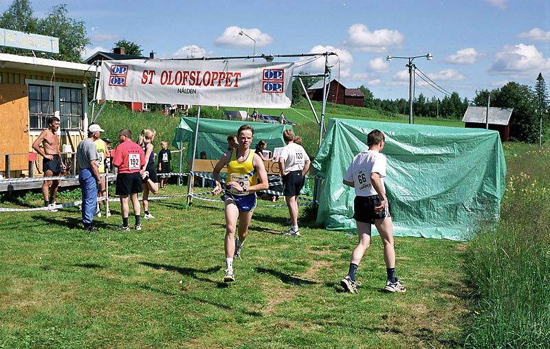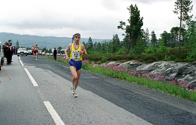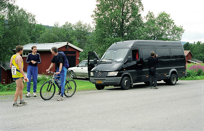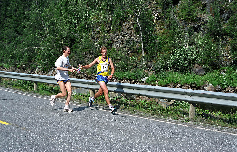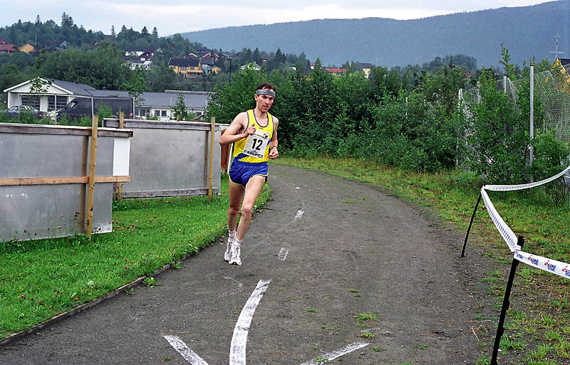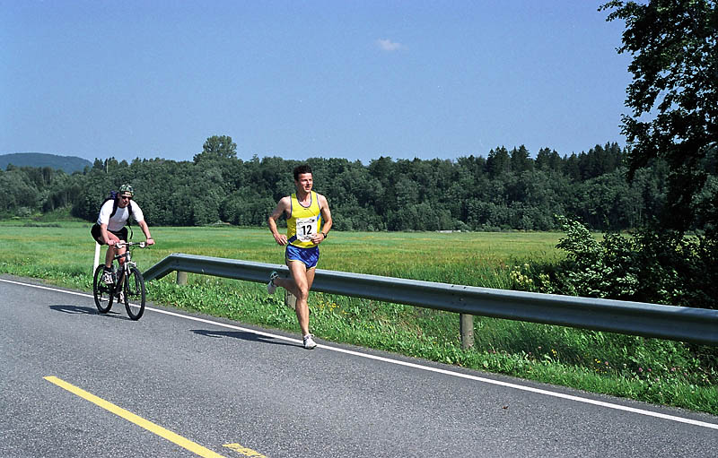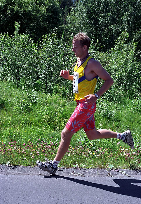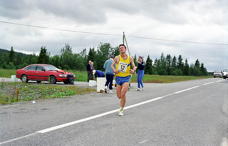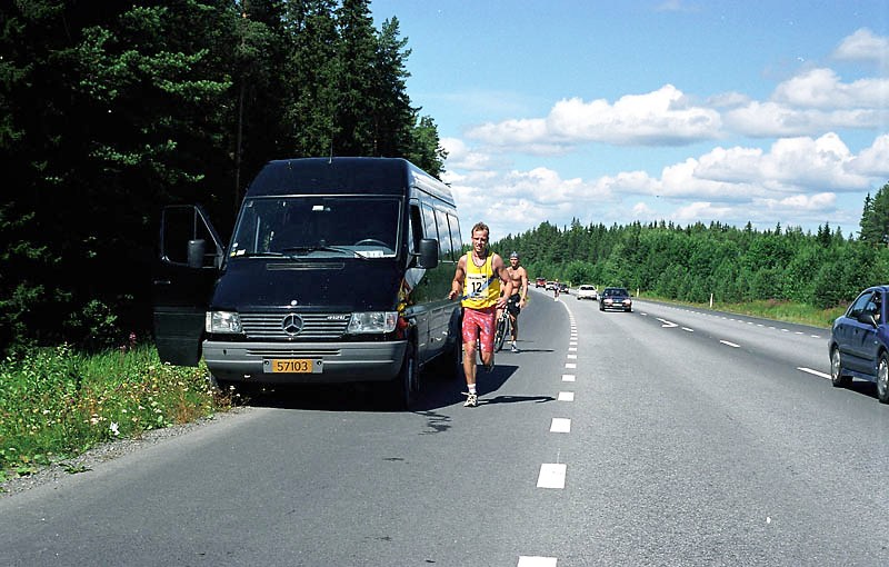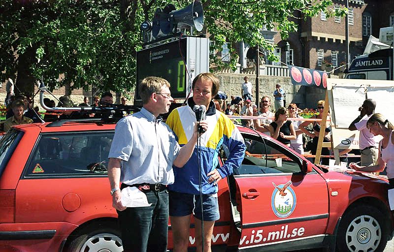 Per Kr. Saastad var vår ankermann inn i Østersund i 2002, og løp en halvmaraton, 21 km, i stekende hete. Det var ikke fritt for at dette gikk en anelse tungt. Dette er et faktum og naturligvis ikke en kritikk av Per, som vi ser her: Per Kristian 1, Per Kristian 2, Per Kristian 3, Per Kristian 4.
