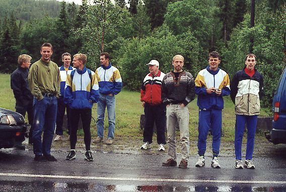 "Gjengen," som nå har kommet seg ned i lavlandet og er omgitt av skogsterreng. Bildet viser fra venstre: Jon Rune Sjøli, Ole Jacob Næss, Lars Granum, Øyvind Sørensen, Atle Nerli, Roald Moe, Simen Haugen, Trond Olav Berg, Hermann Bruun.