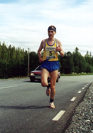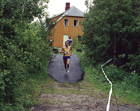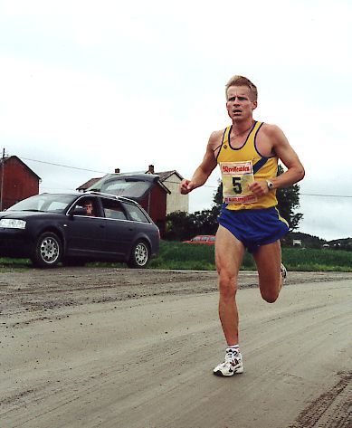 Øyvind Sørensen har forsømt å sende inn sin utøverpresentasjon, og er derfor et nokså ubeskrevet blad for forfatteren av disse linjer. Men hva gjør vel det når han løper så godt som han gjør? Her utfolder han seg hemningsløst langs veien, mens Ole Jacob Næss heier. Ola Høgli skimtes i bakgrunnen.