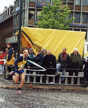 Simen Haugen i kjent og god stil langs (gang)veien. Det må formodes å ikke være noen utpreget hemmelighet i friidrettskretser at nevnte Haugen er gift med en dame som nok i sterk grad medvirker til å opprettholde hans løperegenskaper. Simen antyder selv at fremskreden alder, derunder hans egen, er en betydelig hemsko for løpere. Imidlertid kan vi alle i Bøler være lettet over at Simen i så måte heldigvis ikke praktiserer hva han predikerer. Fotografen (PIOE) tar på seg skylden for lyktestolpen som vokser ut fra Simens hode.