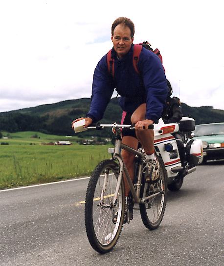 Dette er lagleder og langdistansetrener Jan Erik, som - faktisk - ledsaget løperne så å si hele løpet pr. sykkel. Tatt i betraktning at dette betød rundt åtte mil i snitt gjennom løpets fire dager, er det strengt tatt mer enn man kunne forvente av en lagleder, og innsatsen ble verdsatt av løperne, som både ble videofotografert og gitt vann og fuktige svamper ved behov. NB: Lagleder måtte gå av sykkelen og løpe ved siden av hver gang dette løperne skulle ha noe av dette, siden det ikke er lov å gi løpere service fra bil eller sykkel.