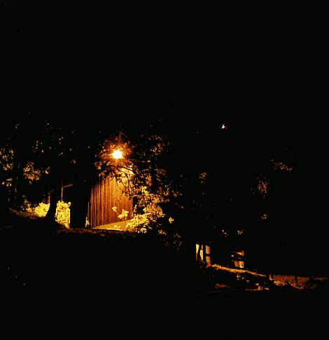 Slik ser altså hovedbygningen på Vangen ut, bare belyst av en utelampe, en bekmørk augustnatt. Du kan se det grønngule skjæret i småbuskene, og at alt lys er slukket i selve huset. Men det lyser fra kjellervinduene.